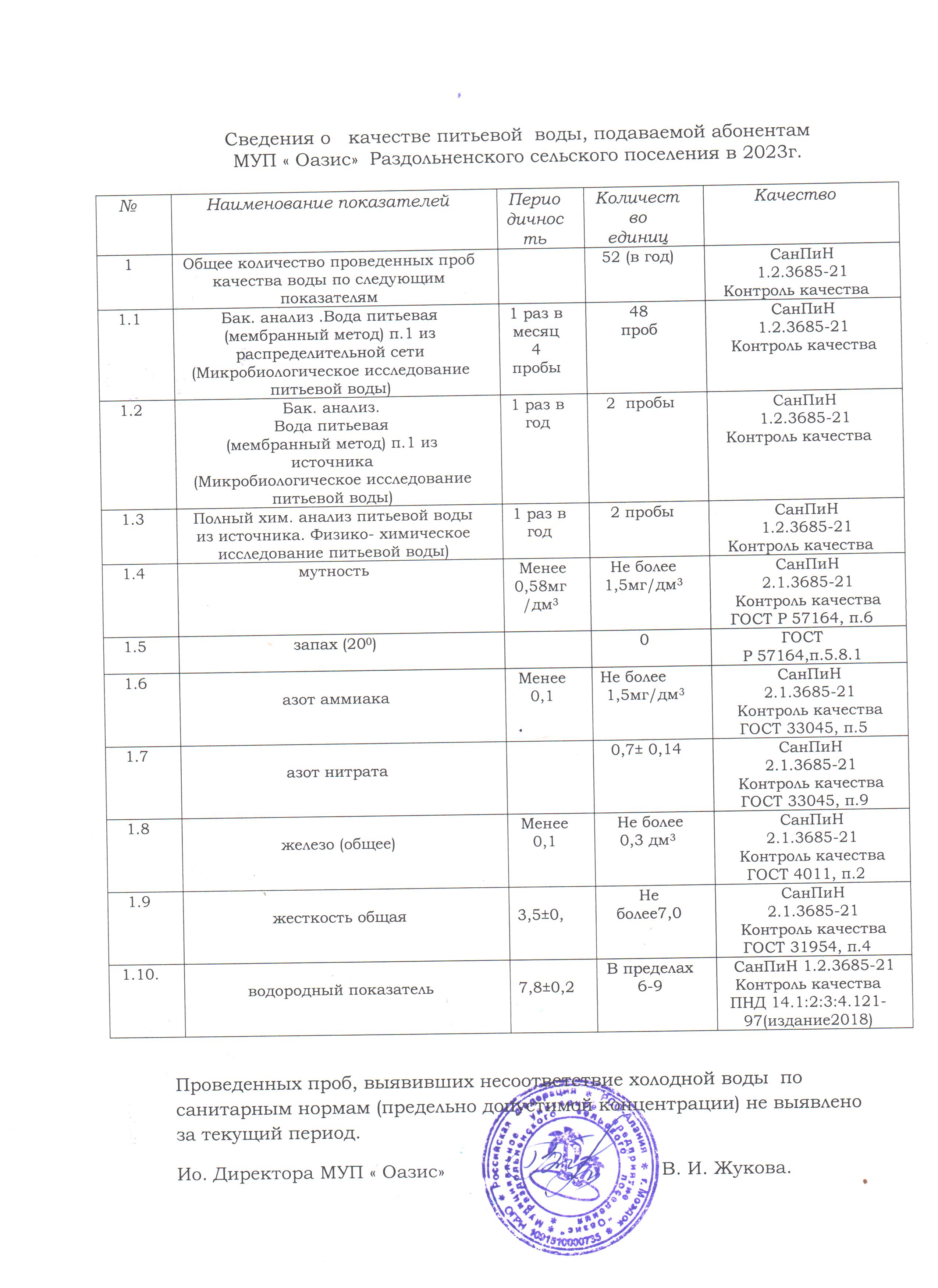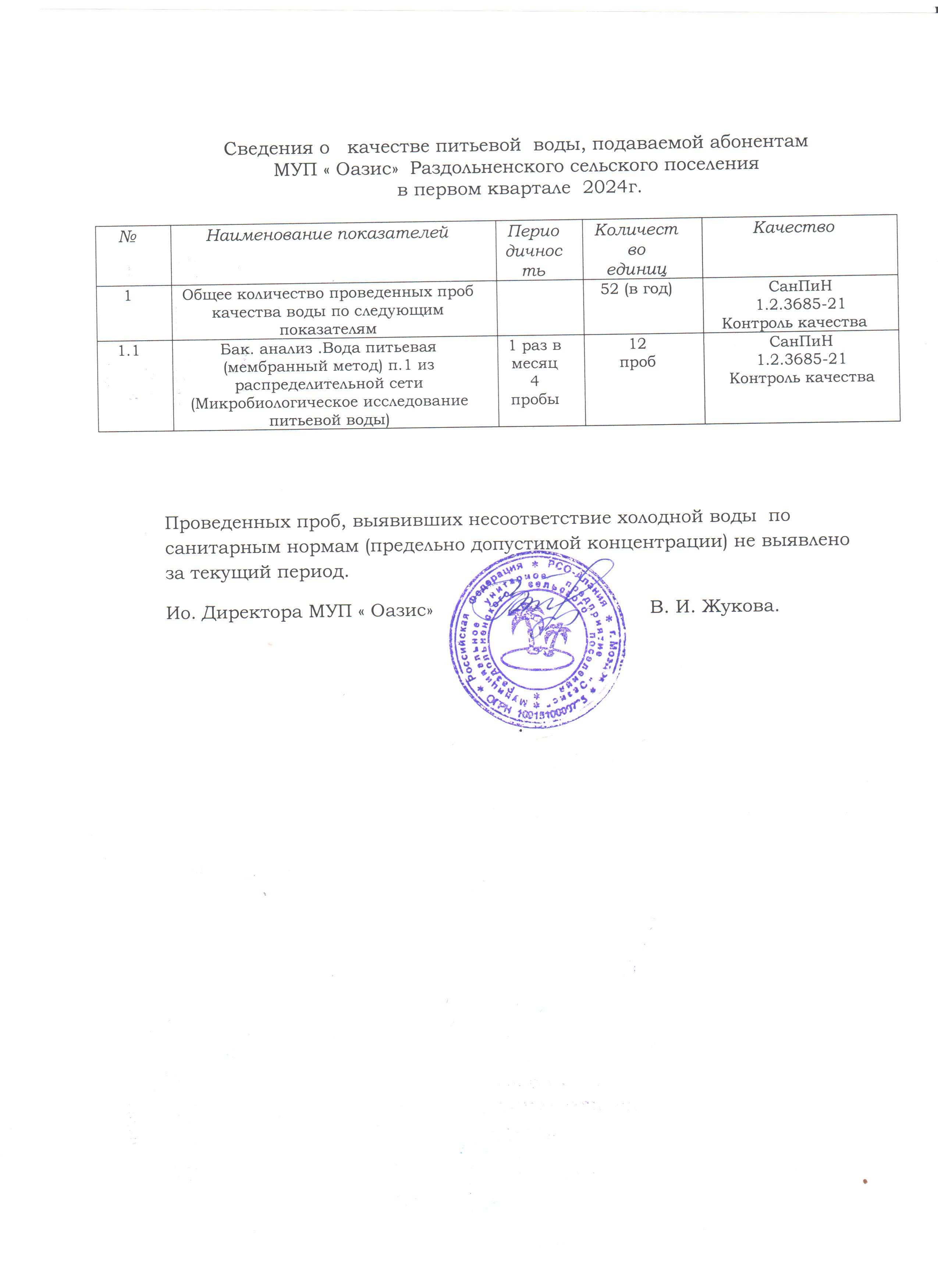 Сведения о качестве питьевой воды, подаваемой абонентам МУП Оазис Раздольненского сельского поселения за 1 квартал 2024 года (2)
